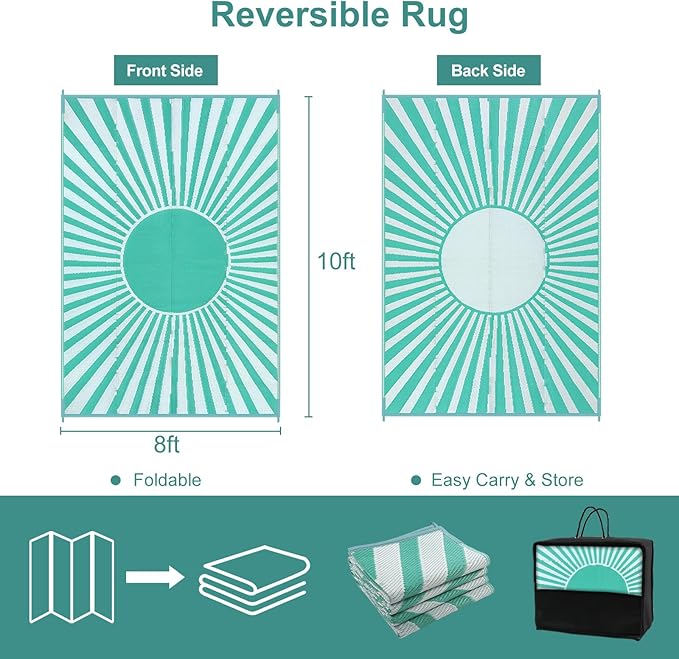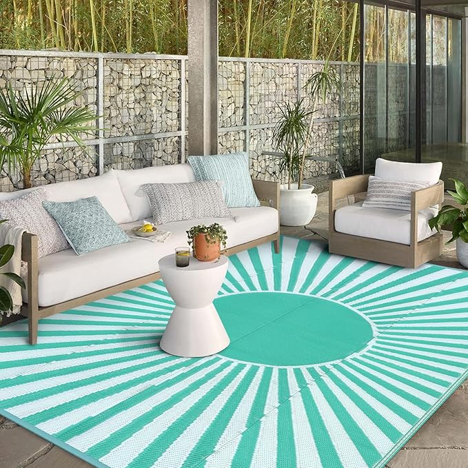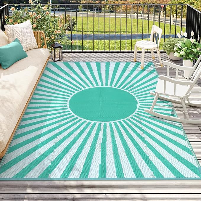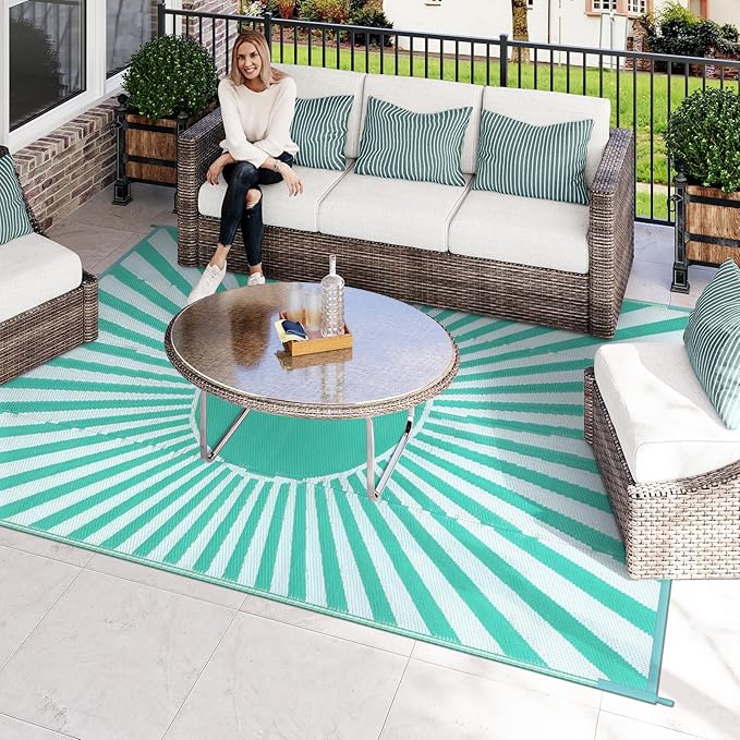 - [Versatile Outdoor Rug] The large outdoor rug is woven from a breathable, comfortable plastic material that won't damage your deck or lawn. Ideal for patio, deck, garden, backyard, balcony, camping, picnics, tent, RV road trips, beach and indoor rooms
