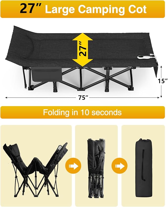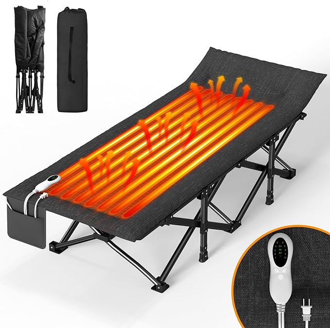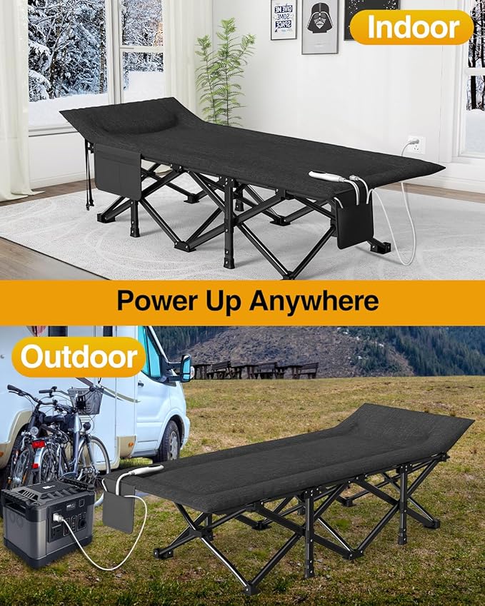 ZENPETIO Heated Camping Cot for Adults, Durable Foldable Cot Bed with Pad & Carry Bag, Portable Sleeping Cot for Camping Home Guest Stay, Direct Plug-in Design for Reliable Heating, Black