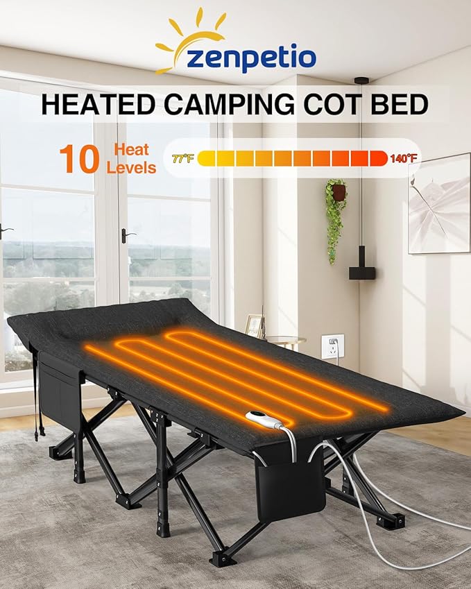 - 【Heated Comfort】Experience unparalleled warmth with the ZENPETIO Heated Camping Cot. Featuring adjustable temperature settings (from 77 °F to 140 °F) and multiple timing options, you can easily customize your comfort. Designed with an overheat protection mechanism, this cot ensures safe, cozy nights under the stars. A blanket is recommended for added warmth (not included).
