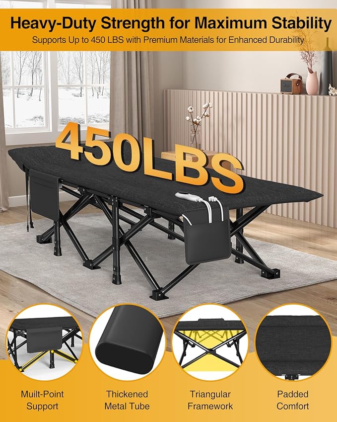 - 【Durable and Stable】Constructed with a robust anti-rust steel frame and thickened polyester fabric, our cot supports up to 500 lbs. With 10 sturdy legs featuring non-slip pads and added stability bandages, you can count on a secure and comfortable sleep every time.