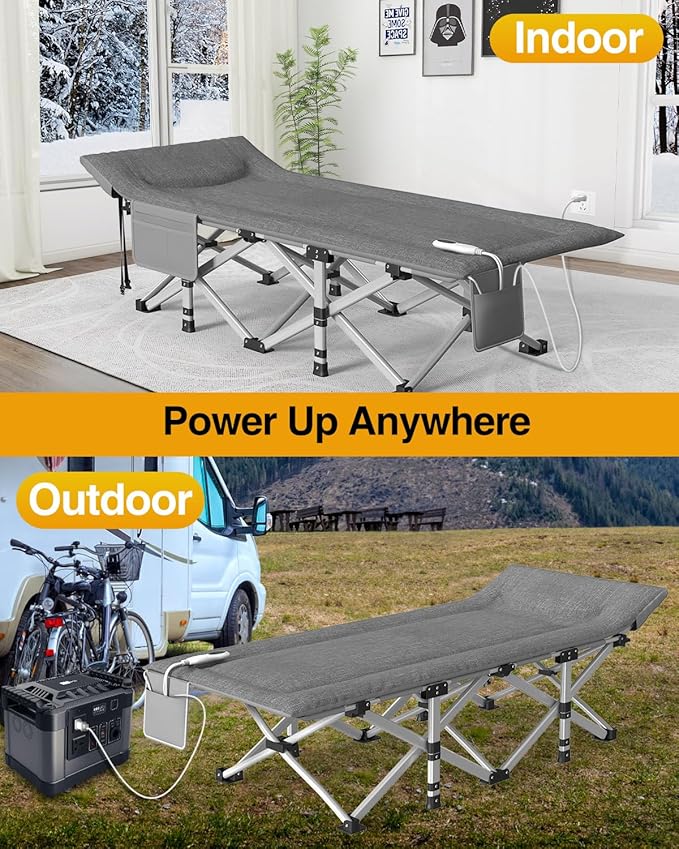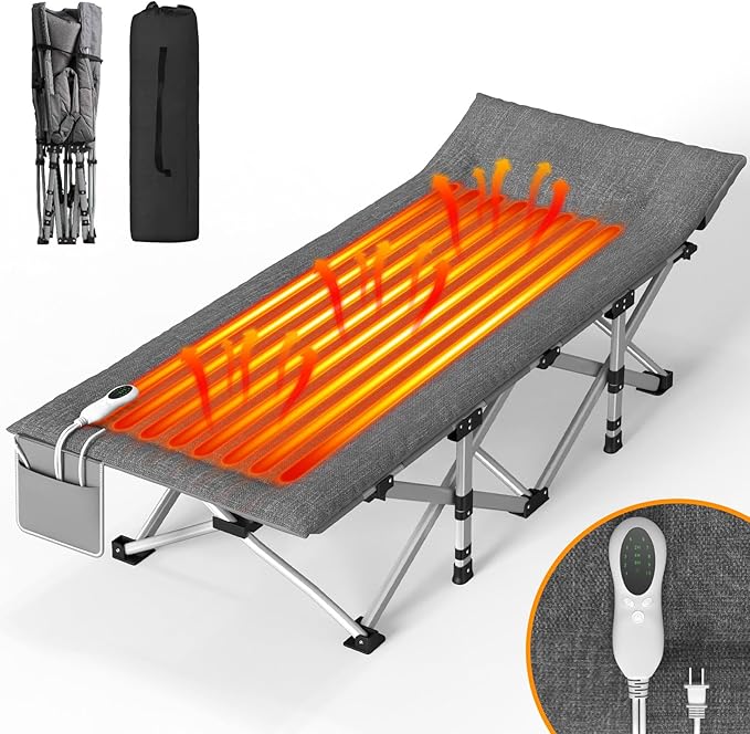 ZENPETIO Heated Camping Cot for Adults, Durable Foldable Cot Bed with Pad & Carry Bag, Portable Sleeping Cot for Camping Home Guest Stay, Direct Plug-in Design for Reliable Heating, Gray