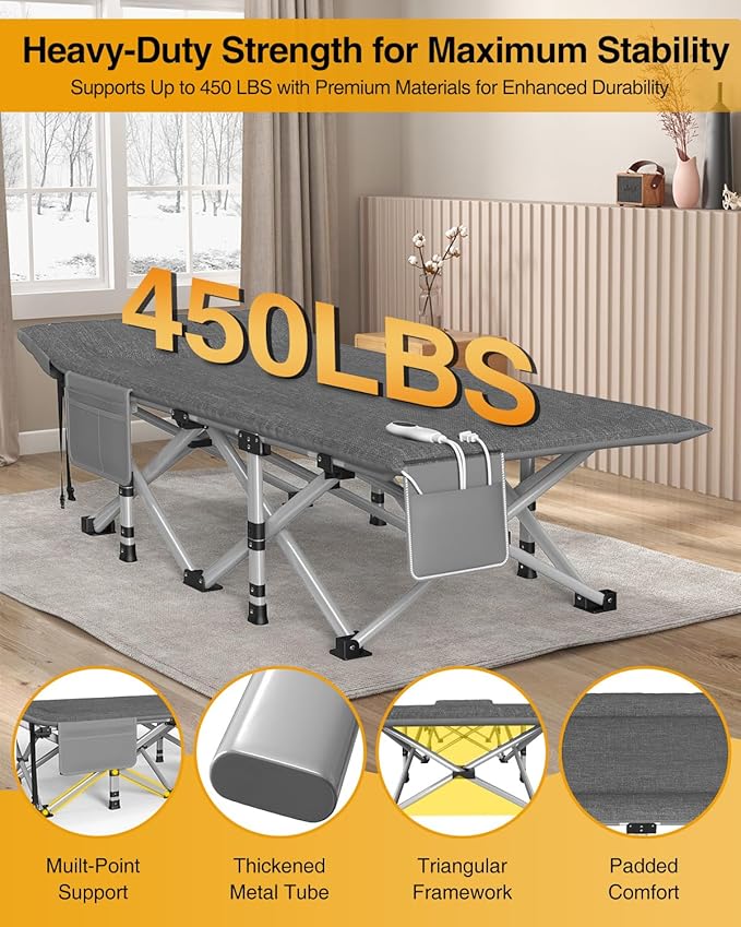 - 【Durable and Stable】Constructed with a robust anti-rust steel frame and thickened polyester fabric, our cot supports up to 500 lbs. With 10 sturdy legs featuring non-slip pads and added stability bandages, you can count on a secure and comfortable sleep every time.