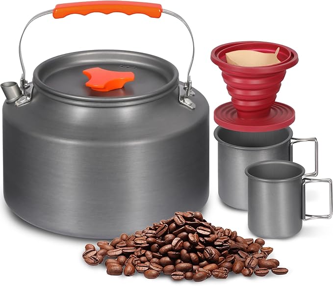 REDCAMP 2L Camping Coffee Pot Coffee Makers, Aluminum Portable Kettle Teapot with 2Pcs Camping Mug and Collapsible Coffee Dripper, Compact Tea Kettle for Stove Top, Outdoor, Hiking and Traveling