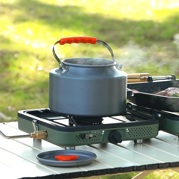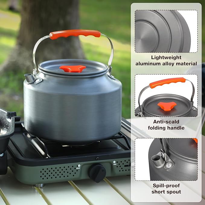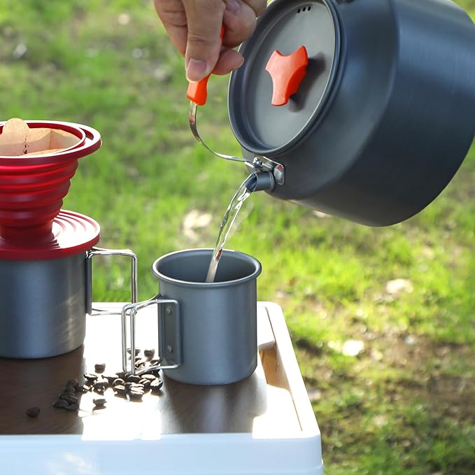 - High Quality Material: Made from oxidation aluminum, our camping kettle with cups is lightweight, rust-proof, and designed to withstand high temperatures. The user-friendly, foldable handles on both the teapot and cups prevent burns and enhance safety during use.