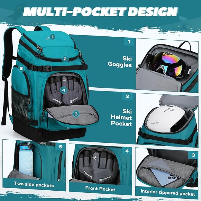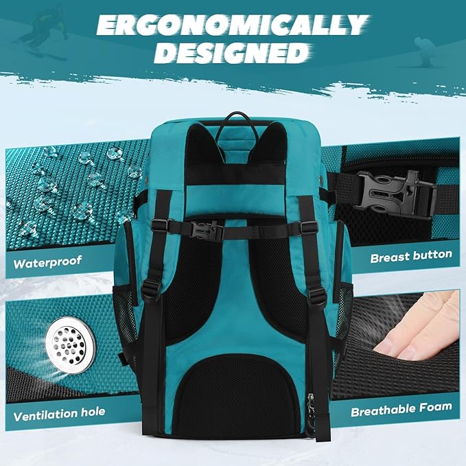 - Spacious and Organized Storage: Ski boot backpack measures 21.66*13*11.4 inches and has multiple compartments to neatly organize ski boots, helmets, gloves, and other gear, snowboard backpack ensures all your essentials are easily accessible and well-protected during transport