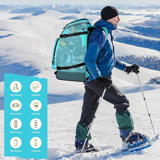 - Spacious and Organized Storage: Ski boot backpack measures 21.66*13*11.4 inches and has multiple compartments to neatly organize ski boots, helmets, gloves, and other gear, snowboard backpack ensures all your essentials are easily accessible and well-protected during transport