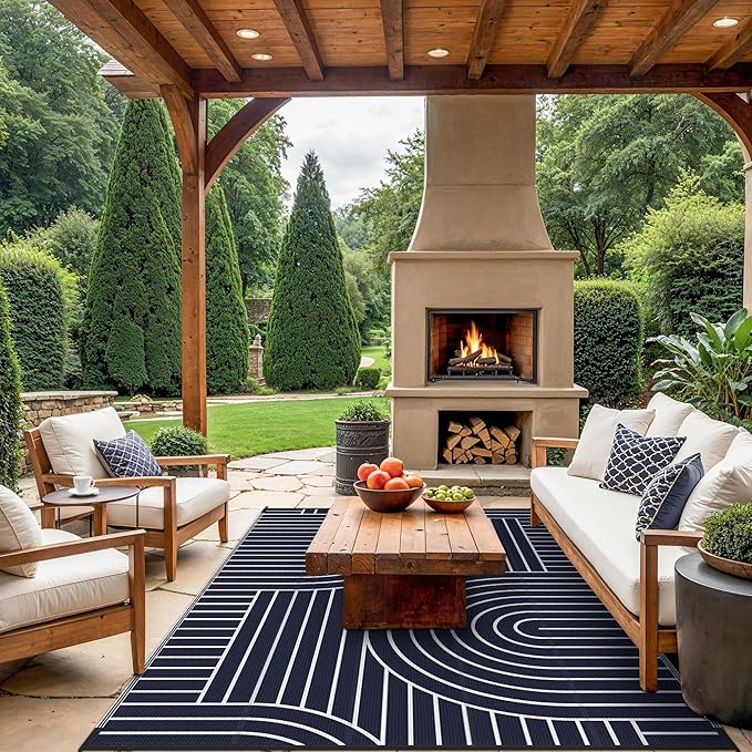 - Stylish Geometric Design: Elevate your outdoor spaces with GENIMO's striking geometric outdoor rug. The modern frame and sleek rectangular center create a timeless visual appeal, blending effortlessly with nature. Whether you're decorating your patio, garden, balcony, or RV, this geometric pattern will bring an elegant touch to any environment