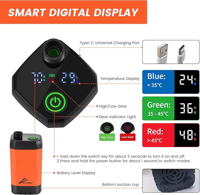 - 【Smart LCD Display 】The water pump comes with a high-definition LCD screen that displays real-time battery life and water temperature. The included TEPY-C charging cable offers wide compatibility with computers, car adapters, and power banks. With two working modes, it adapts to different needs and is IPX7 waterproof for peace of mind.