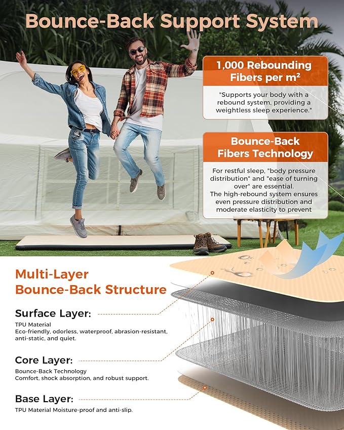 - CUSTOMIZABLE FIRMNESS & HIGH-BOUNCE SUPPORT: Not your average inflatable mat—adjust firmness for soft, medium, or firm support. This high-resilience camping mat allows you to jump on it without losing its shape or support. Sit, sleep, or even jump with cloud-like comfort, making it a great alternative to bulky foam sleeping mats or thin air pads.