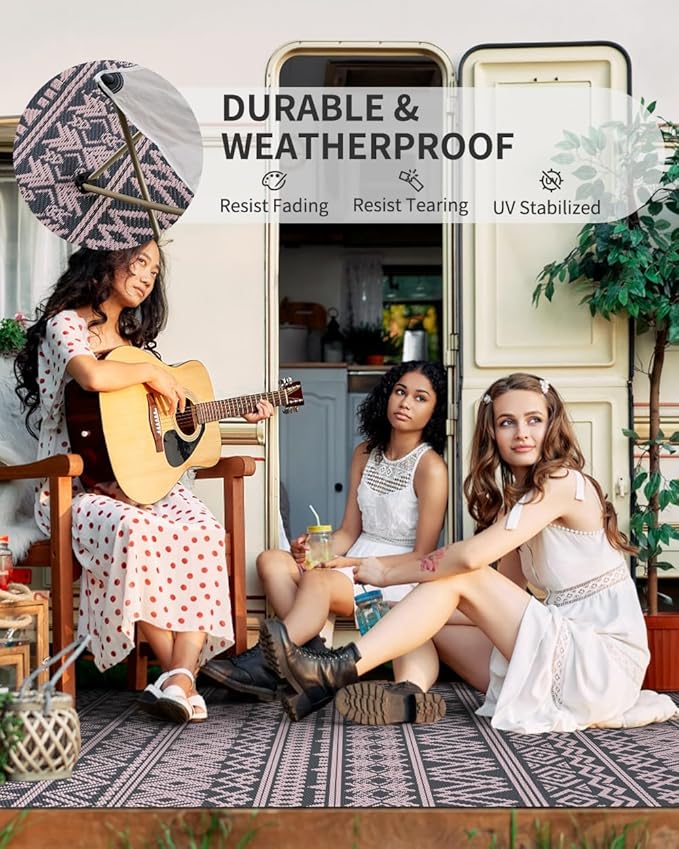 MontVoo Outdoor Rug Carpet Waterproof 5x8 Outdoor Patio Rug Mat Reverisble Plastic Straw Outdoor Rug for RV Camping Picnic Beach Balcony Boho Pink Grey