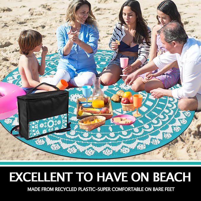 Capslpad 8Ft Round Outdoor Rug for Patio Clearance Boho Reversible Mat Waterproof Outdoor Plastic Straw RV Camping Rug Outside Circle Area Rug for Porch Deck Terrace Picnic Beach Apartment, Teal