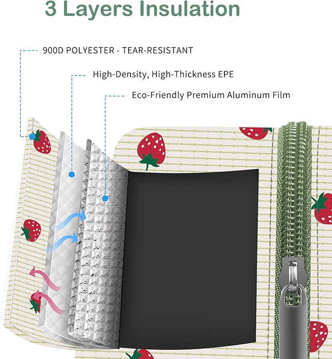 - SUPERIOR MATERIAL : Reusable lunch bag with thickened waterproof aluminum foil and three layers of insulation. Provides excellent thermal performance, durability, and easy cleaning. Keeps food cool or warm for 3-4 hours. Leakproof, lightweight, and features a soft handle for convenience
