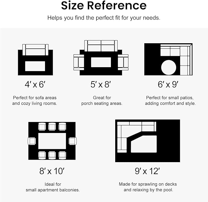 - [Versatile & Functional] Our outdoor rugs 9x12 are soft, Hard-wearing, and suitable for patios, decks, gardens, beaches, picnics, RV camping, garages, balcony, backyard, living rooms, indoor and outdoor use.