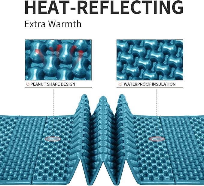 • 【Peanut Shape and Space Saving】Camping foam sleeping pad for camping features Peanut shape design and accordion-style design. Peaks and valleys work together to reinforce support capacity and trap nest one to another inside to save space when packed.