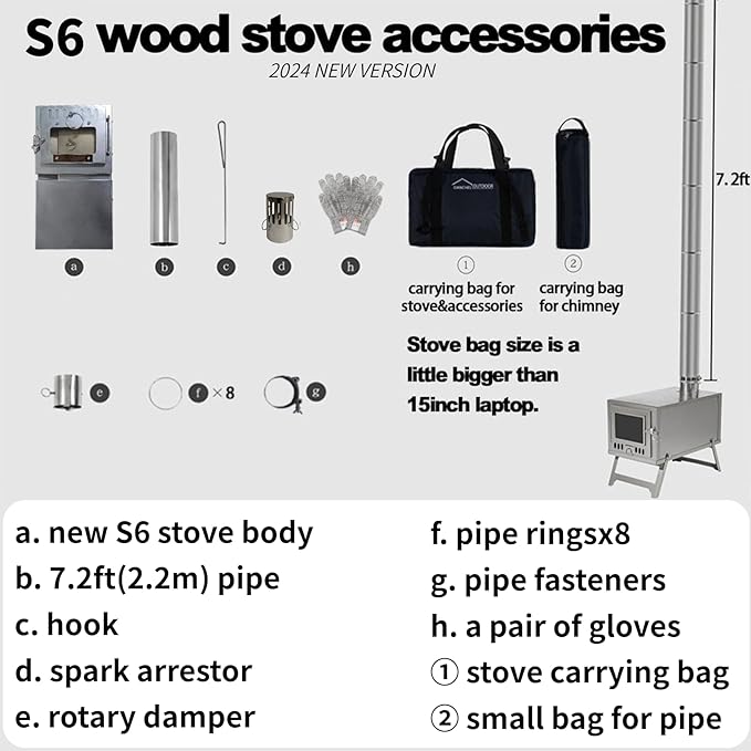 - DURABLE &EFFICIENT: 2024/10 NEW design S6 stove enhanced durability of top and side. Made of rust-resistant 304 stainless steel (0.6mm thickness) and 0.08mm thick pipe. Damper and door air intakes is easy to control the burning process, making it a reliable heating solution for 3m hot tent camping.