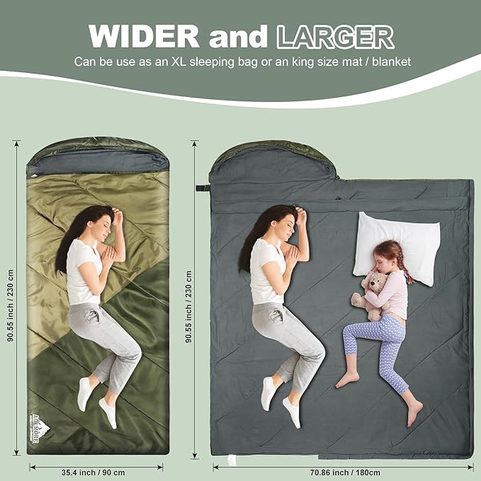 - LARGE AND ROOMY: Our single sleeping bag measures (78.7+11.8)in x 35in,double sleeping bag measures (78.7+11.8)in x 61in, fits for people up to 6ft tall with plenty of room to stretch or roll over. The separated bottom zipper lets you ventilate the foot section for better temperature control. On warm nights, unzip it and use like a blanket.