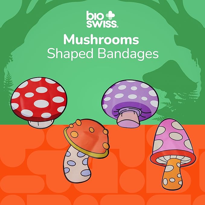 - MUSHROOM BANDAGES: This 24 piece pack of mushrooms shaped bandages features 4 fun mushroom shapes, and is great for putting a smile on kids' faces while protecting wounds such as cuts, scrapes, and burns; sticky bandages come in a cute cardboard box and are perfect for kids and adults alike, and also for school nurses and pediatric doctors