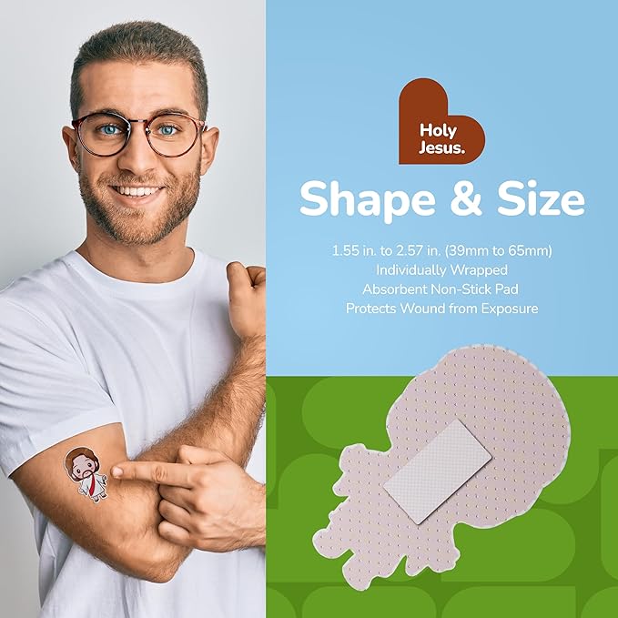 - HOLY JESUS BANDAGES: This 50 piece tin of Jesus shaped bandages is great for putting a smile on kids' faces while protecting wounds such as cuts, scrapes, and burns; sticky bandages come in a cute tin and are perfect for kids and adults alike, and also for school nurses and pediatric doctors