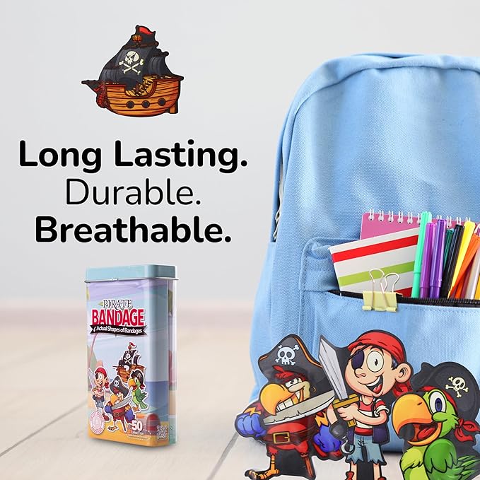 - PIRATES BANDAGES: This 50 piece tin of pirate shaped bandages features 4 fun pirate, parrot, and pirate ship shapes, and is great for putting a smile on kids' faces while protecting wounds such as cuts, scrapes, and burns; sticky bandages come in a cute tin and are perfect for kids and adults alike, and also for school nurses and pediatric doctors