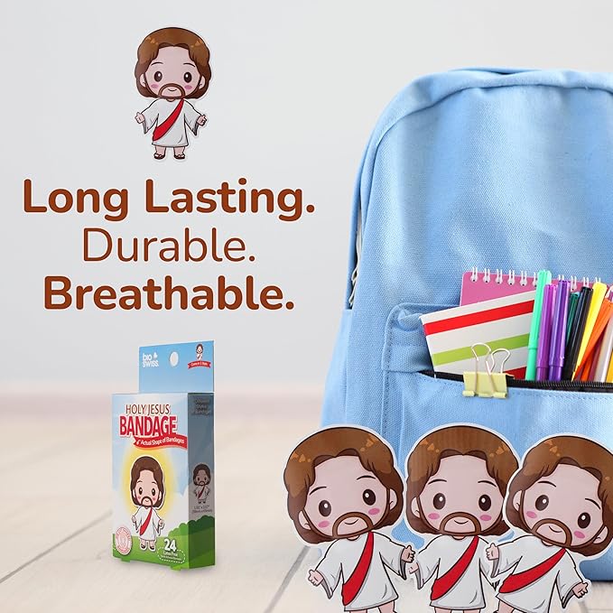 - HOLY JESUS BANDAGES: This 24 piece pack of Jesus shaped bandages is great for putting a smile on kids' faces while protecting wounds such as cuts, scrapes, and burns; sticky bandages come in a cute cardboard box and are perfect for kids and adults alike, and also for school nurses and pediatric doctors