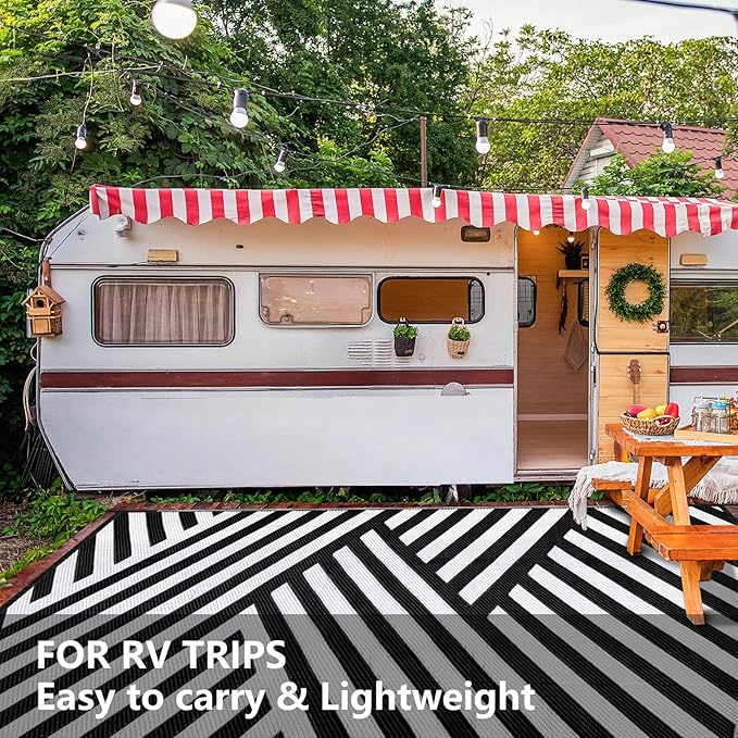 Outdoor Patio Plastic Straw Rug - 9'x18' Outdoor Camping Rug Waterproof Reversible, Area Carpet Patios Clearance RV, Outside Porch Balcony Deck for Camper, White & Black