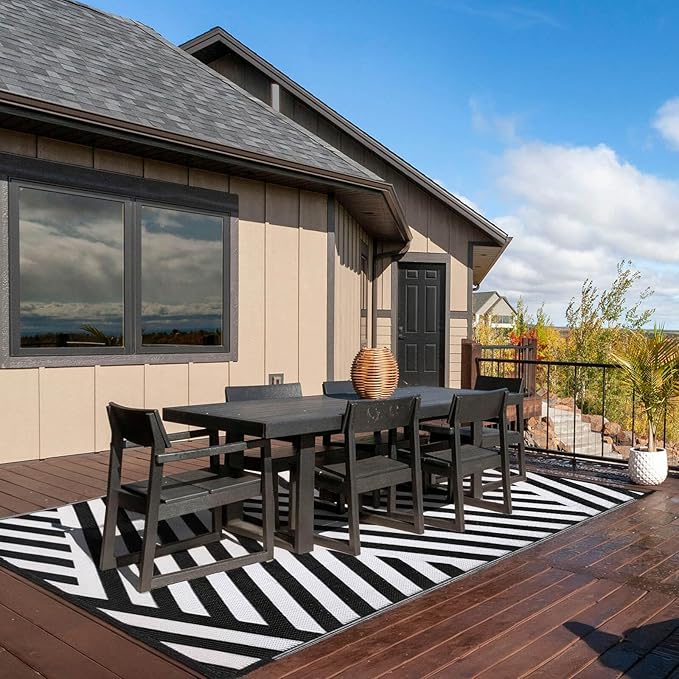 Outdoor Patio Plastic Straw Rug - 6'x9' Outdoor Camping Rug Waterproof Reversible, Area Carpet Patios Clearance RV, Outside Porch Balcony Deck for Camper, White & Black