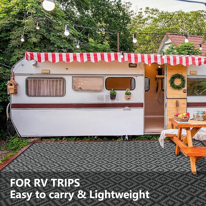 Outdoor Patio Plastic Straw Rug - 9'x12' Outdoor Camping Rug Waterproof Reversible, Area Carpet Patios Clearance RV, Outside Porch Balcony Deck for Camper, Black & Grey