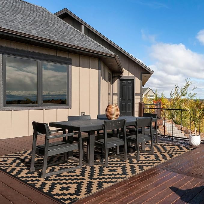 Outdoor Patio Plastic Straw Rug - 6'x9' Outdoor Camping Rug Waterproof Reversible, Area Carpet Patios Clearance RV, Outside Porch Balcony Deck for Camper, Black & Brown