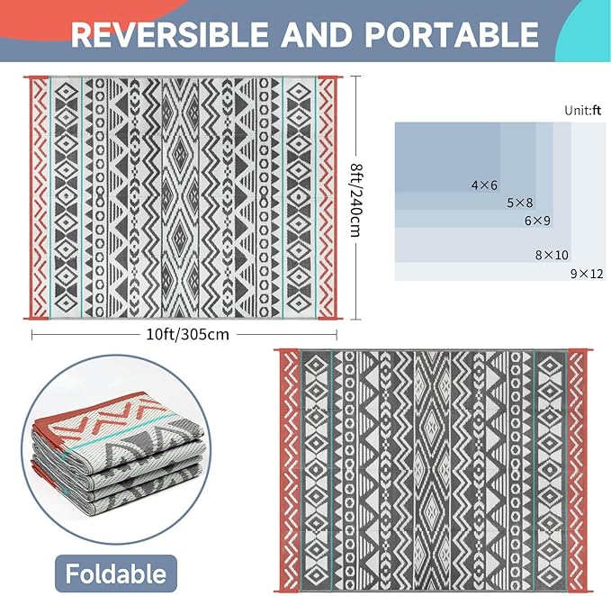 - ๐๐๐ฏ๐๐ซ๐ฌ๐ข๐๐ฅ๐ ๐๐ฎ๐ : Our outdoor patio rugs for beach trips and porches are crafted from 100% polypropylene with dual-sided usability. Featuring heat-sealed edges to resist fraying, the ventilated design ensures compatibility with most outdoor surfaces