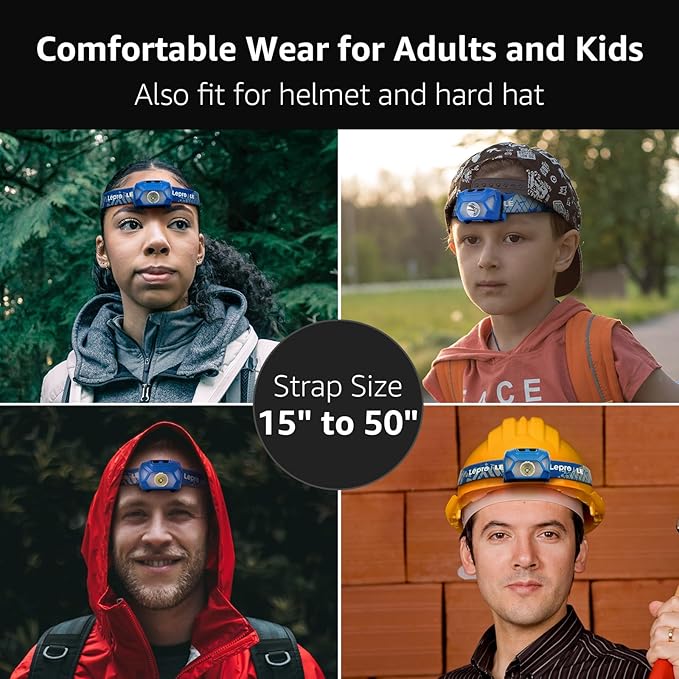 - Adjustable Headband, Comfortable to Wear - With its removable, washable, and elastic headband, this head lamp is comfortable for both adults and kids to wear, and can even fit hard hats or helmets. Weighing only 1.94oz (3.5oz with batteries), it's the perfect LED headlamp for long-distance runners and outdoor adventurers.