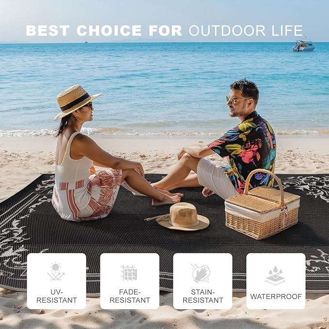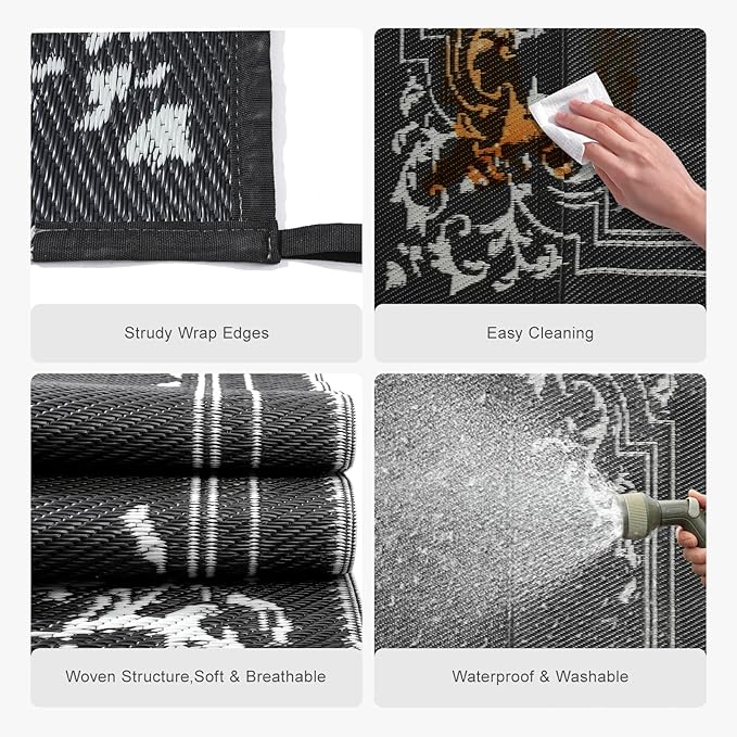 - EASY TO CLEAN & PORTABLE: Due to the woven design of the mat, it allows for it to be easily cleaned by wiping with a wet cloth or rinsing with water. This outdoor mat is also portable and can easily be packed up and brought with you on all your adventures, camping, barbecue picnic, beach trips or a RV travel.