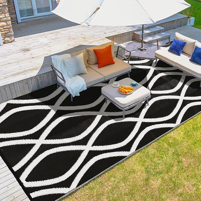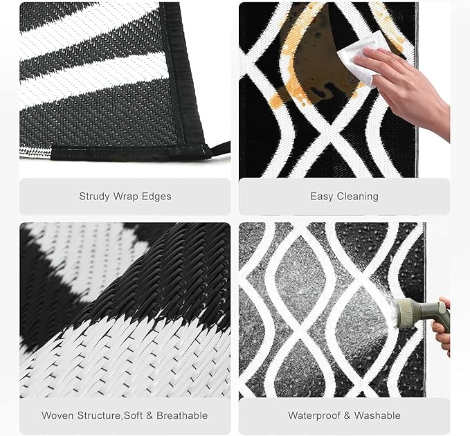 wikiwiki Outdoor Rug, 6x9ft Waterproof Reversible Mat Indoor Outdoor Rugs Carpet, Small Area Rug Plastic Straw Rug for Patio Deck Balcony Pool RV Camping Beach Picnic, Black & White, Rugscape Series