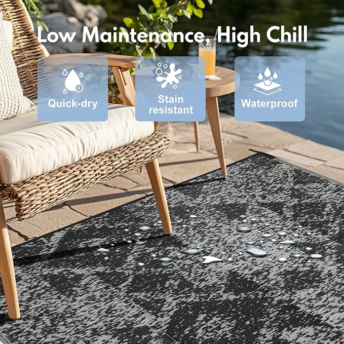 - WATERPROOF & EASY TO CLEAN: Crafted with 100% virgin polypropylene, this outdoor rug features a breathable woven structure. The waterproof material of the patio rug ensures quick drying, while its resistance to stains makes it excellent for active outdoor living. Whether rinsed with a hose, wiped with a cloth, or shaken to remove dirt, maintenance is a breeze, allowing you to spend more time enjoying your outdoor sanctuary