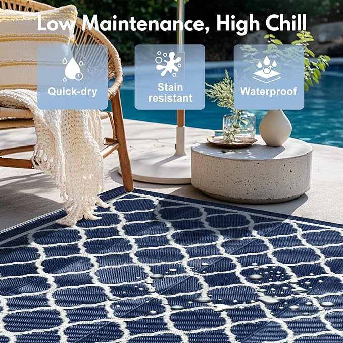 - WATERPROOF & EASY TO CLEAN: Crafted with 100% virgin polypropylene, this outdoor rug features a breathable woven structure. The waterproof material of the patio rug ensures quick drying, while its resistance to stains makes it excellent for active outdoor living. Whether rinsed with a hose, wiped with a cloth, or shaken to remove dirt, maintenance is a breeze, allowing you to spend more time enjoying your outdoor sanctuary