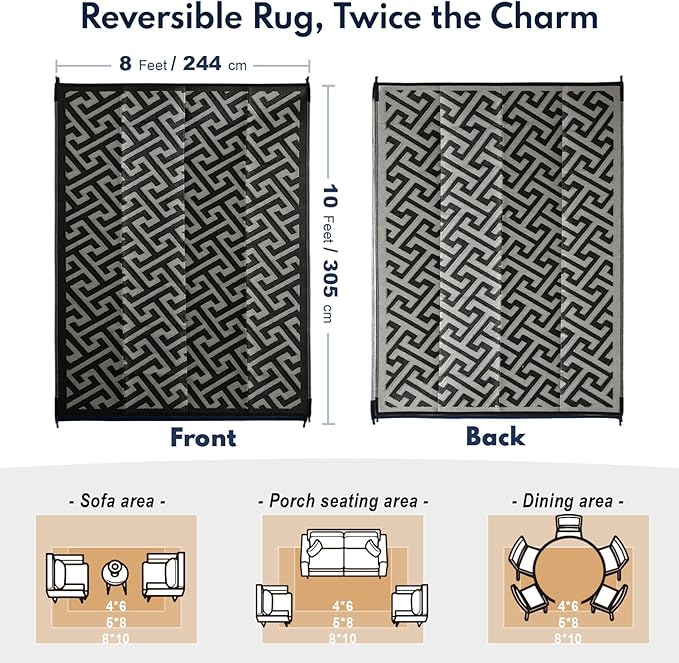 Waterproof Outdoor Rug 8x10 ft, Reversible Plastic Straw Rug, Easy to Clean Patio Rug, Portable Carpet for Patio, RV, Deck, Balcony, Backyard, Picnic, Beach, I-Shaped, Black