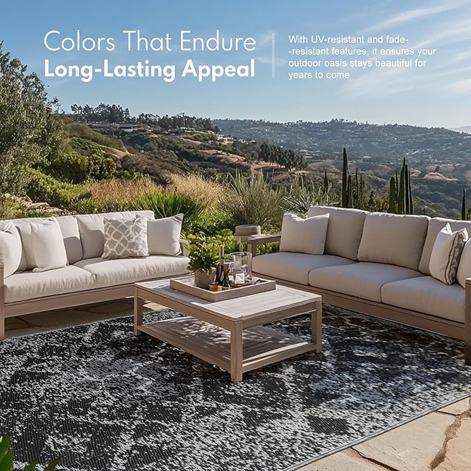 - UV-PROTECTED & LONG-LASTING: Imbued with thoughtful design, this outdoor rug features a UV coating that shields it from fading and sun damage, ensuring its colors remain vibrant and its patterns stay crisp. Its tightly woven fabric and bound edges enhance its durability, making it resistant to everyday wear and tear. To keep it looking its best, we recommend minimizing direct sun exposure when the large outdoor rug is not in use