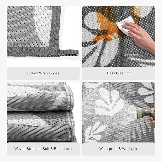 - EASY TO CLEAN & PORTABLE: Due to the woven design of the mat, it allows for it to be easily cleaned by wiping with a wet cloth or rinsing with water. This outdoor mat is also portable and can easily be packed up and brought with you on all your adventures, camping, barbecue picnic, beach trips or a RV travel.