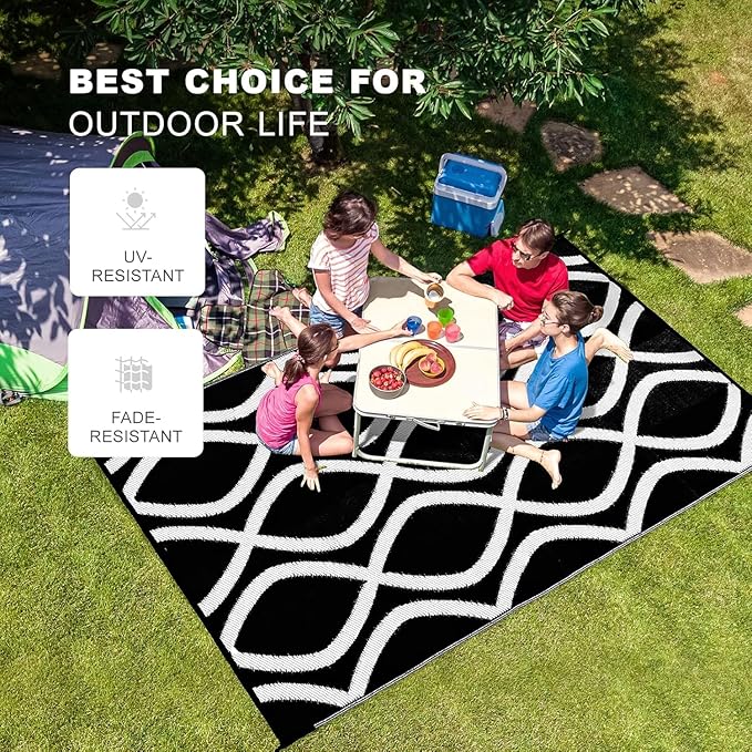 wikiwiki Outdoor Rug, 9x12ft Waterproof Reversible Mat Indoor Outdoor Rugs Carpet, Small Area Rug Plastic Straw Rug for Patio Deck Balcony Pool RV Camping Beach Picnic, Black & White, Rugscape Series