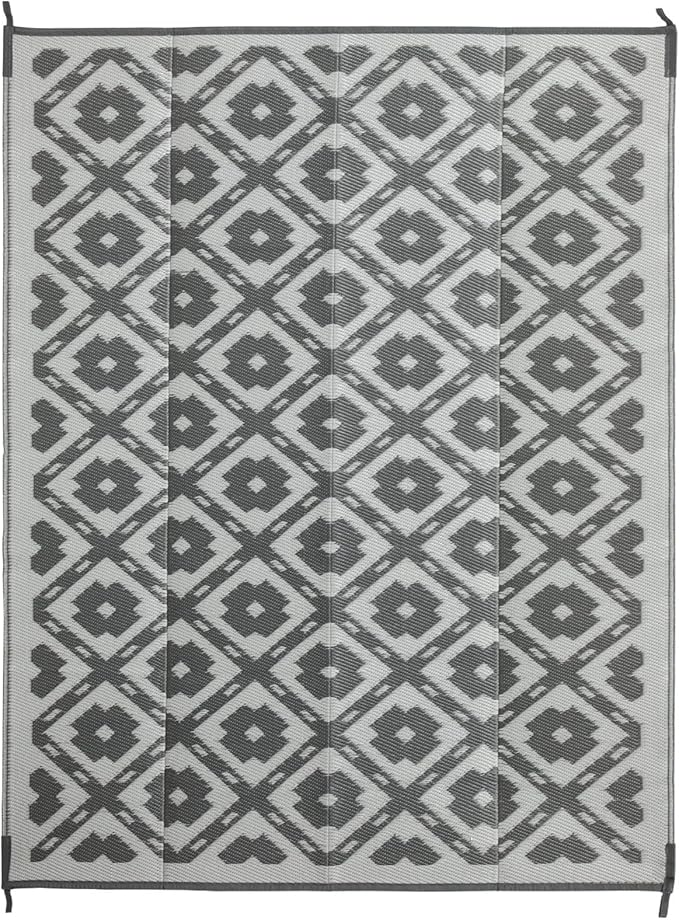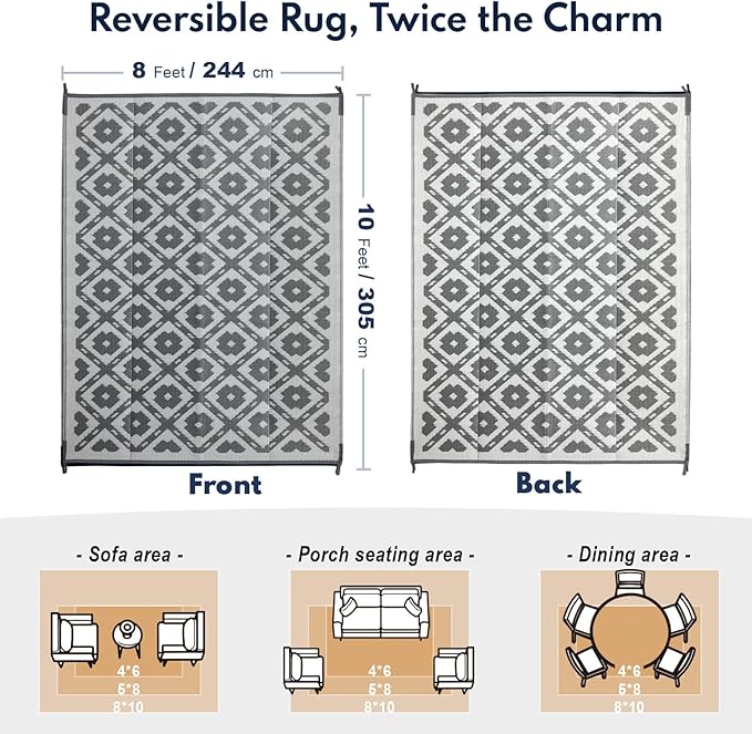 Waterproof Outdoor Rug 8x10 ft, Reversible Plastic Straw Rug, Easy to Clean Patio Rug, Portable Carpet for Patio, RV, Deck, Balcony, Backyard, Picnic, Beach, Square Dashed, Gray