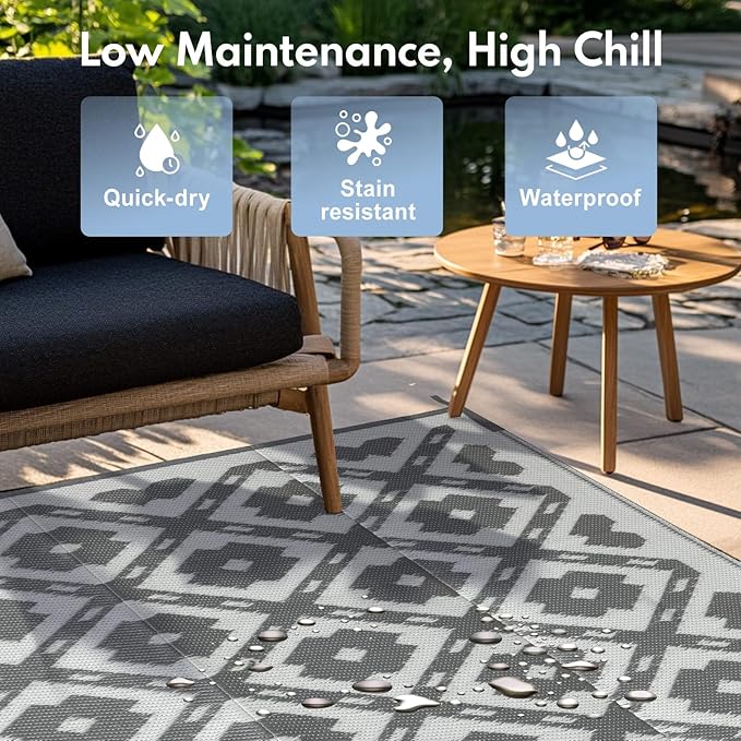 - WATERPROOF & EASY TO CLEAN: Crafted with 100% virgin polypropylene, this outdoor rug features a breathable woven structure. The waterproof material of the patio rug ensures quick drying, while its resistance to stains makes it excellent for active outdoor living. Whether rinsed with a hose, wiped with a cloth, or shaken to remove dirt, maintenance is a breeze, allowing you to spend more time enjoying your outdoor sanctuary