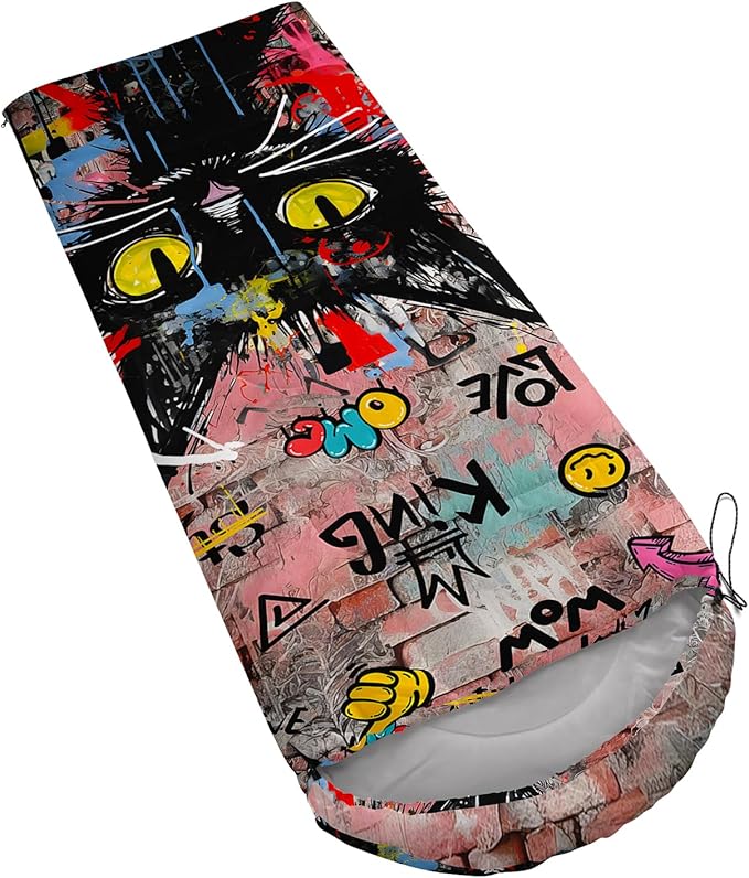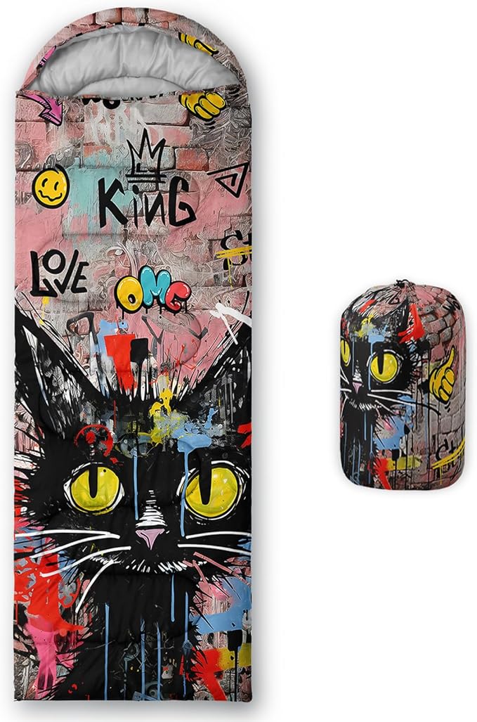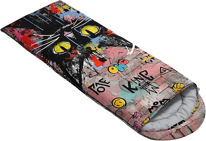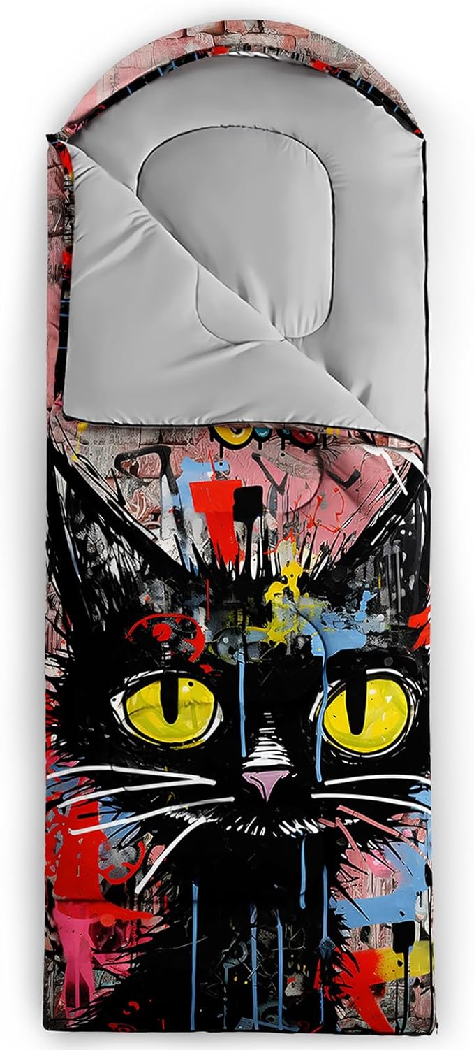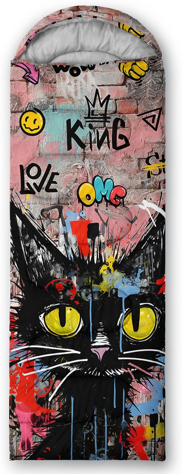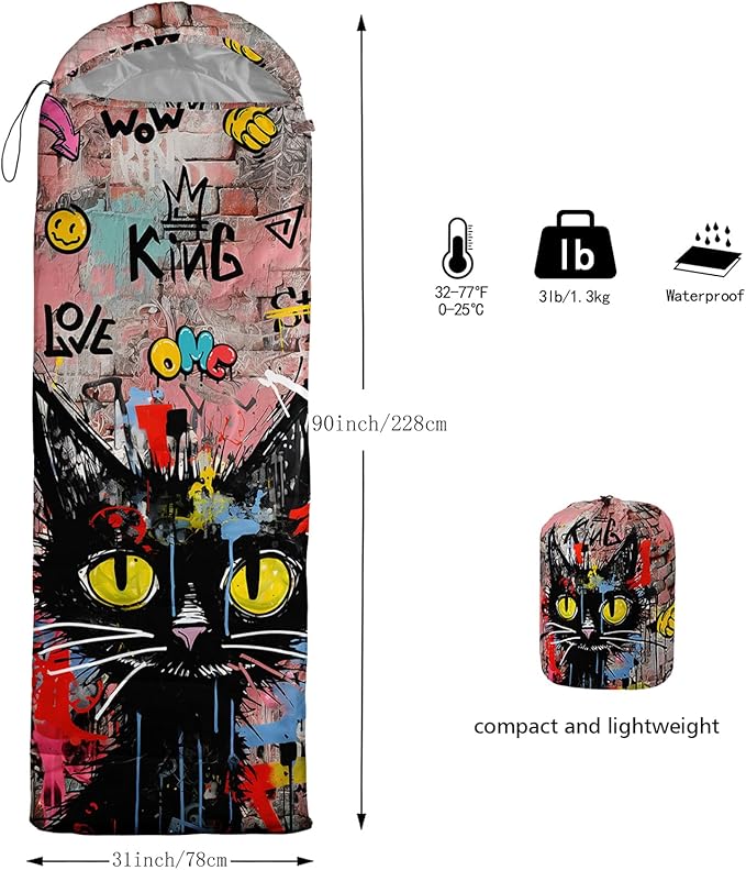 - Unique Cat Design:This Cat pattern sleeping bag is made of 3D digital printing with vibrant colors and patterns,size: 31W x 90L inches,temperature range: 32℉-77℉ (0℃-25℃),it also also have a weather resistant waterproof design to keep you warm and prevent you from any dampness,can be used in 3 seasons