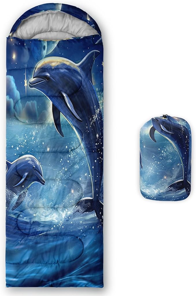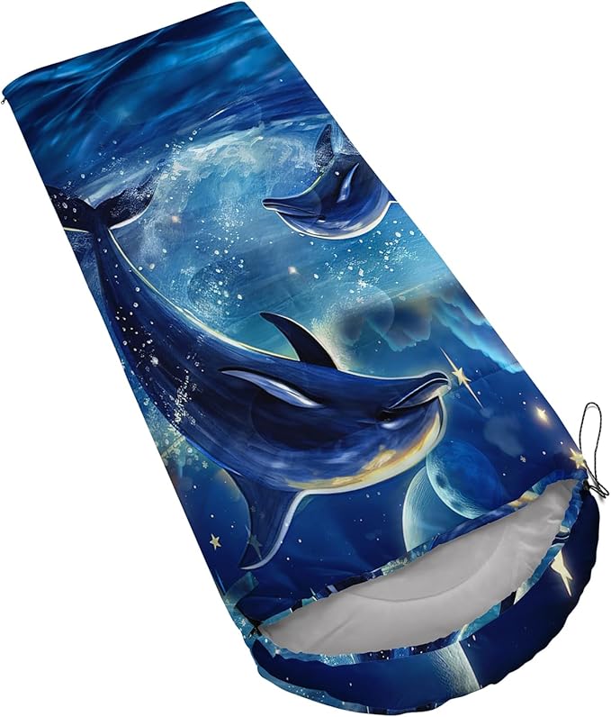- Unique Dolphin Design:This Dolphin pattern sleeping bag is made of 3D digital printing with vibrant colors and patterns,size: 31W x 90L inches,temperature range: 32℉-77℉ (0℃-25℃),it also also have a weather resistant waterproof design to keep you warm and prevent you from any dampness,can be used in 3 seasons