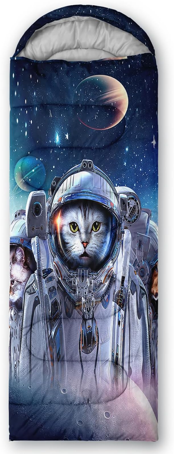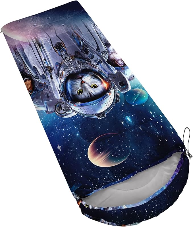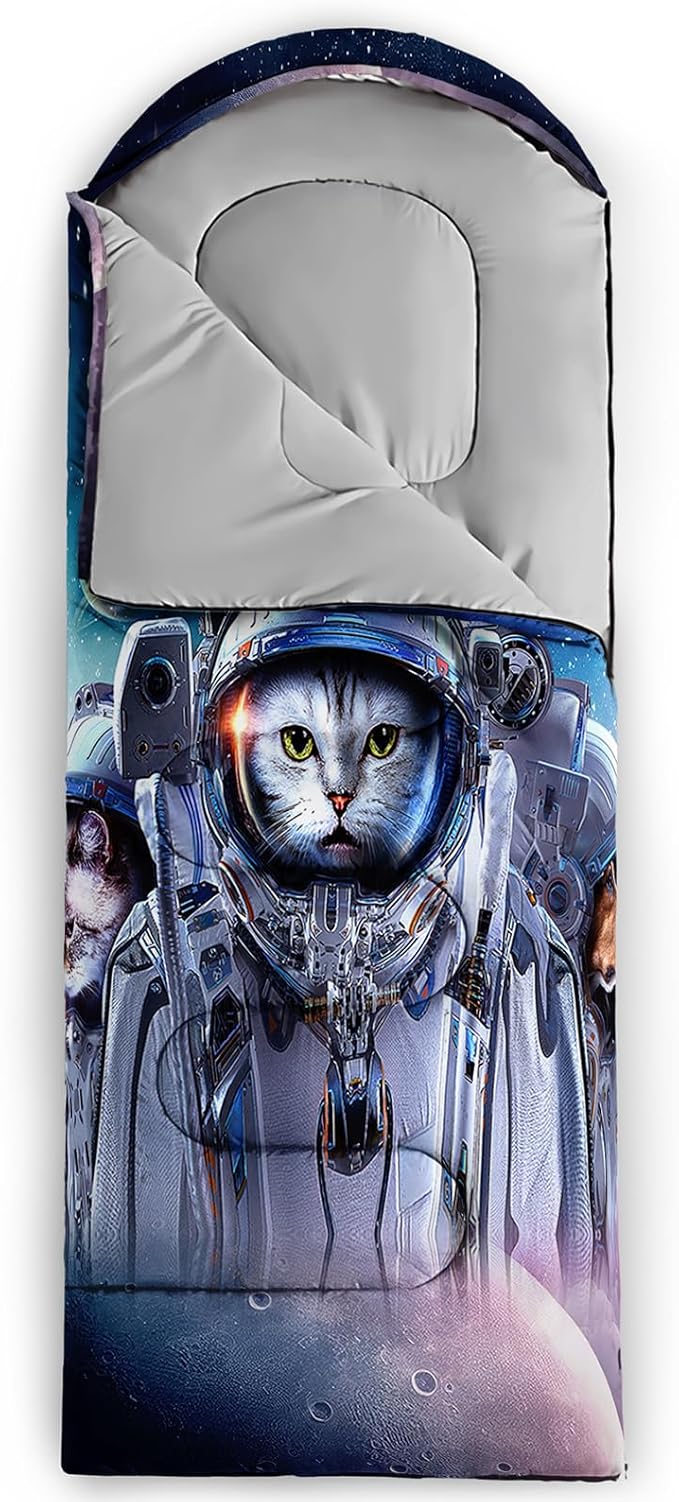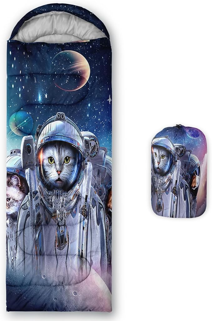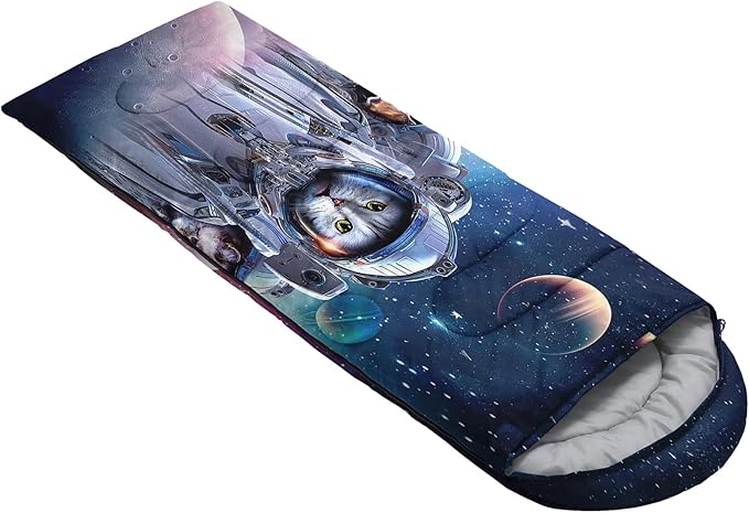 - Unique Cat Design:This Cat pattern sleeping bag is made of 3D digital printing with vibrant colors and patterns,size: 31W x 90L inches,temperature range: 32℉-77℉ (0℃-25℃),it also also have a weather resistant waterproof design to keep you warm and prevent you from any dampness,can be used in 3 seasons