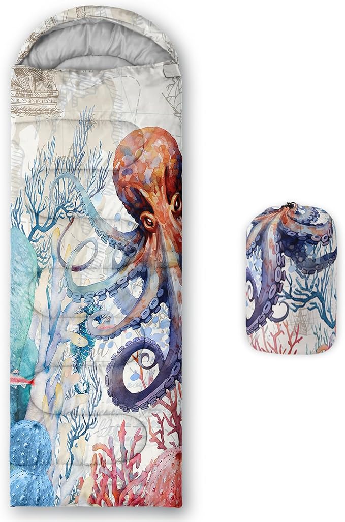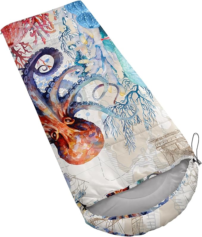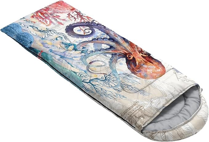 - Unique Octopus Design:This Octopus pattern sleeping bag is made of 3D digital printing with vibrant colors and patterns,size: 31W x 90L inches,temperature range: 32℉-77℉ (0℃-25℃),it also also have a weather resistant waterproof design to keep you warm and prevent you from any dampness,can be used in 3 seasons
