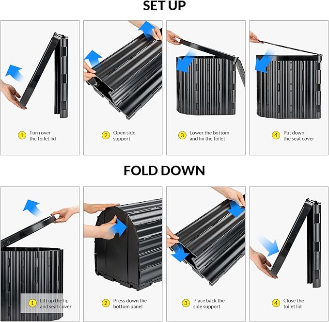 - 【Easier to Use and Portable】This porta potty for camping can be easily set up and fold down in seconds, convenient for quick use in emergency situations. Porta potties come with garbage bags and bio gel, which helps to solidify liquid waste. Cleanup and disposal are much easier, as a result. It also comes with a disposable toilet seat, which makes it more hygienic for you to use.
