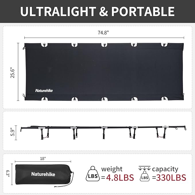 - 【Sturdy & Stable】With aircraft grade 7075 aluminum alloy which is 67% stronger and 75% lighter than ordinary cot frame. Besides, 5 heavy duty legs are far more supportive and stable than 3 legs' cot. It's sturdy enough to support max 330 lbs while keeping the bed flat and preventing sinking