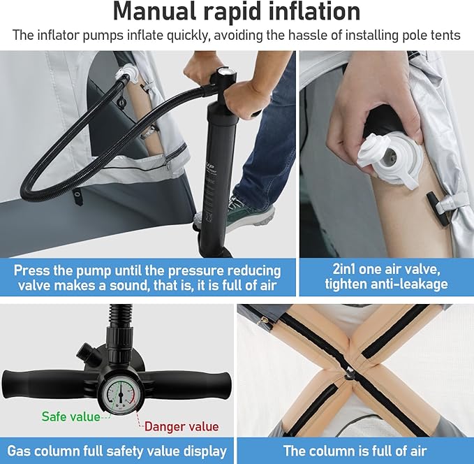 - Effortless Setup in 3 Minutes:Ditch the time-consuming assembly struggles! No poles needed. TPU inflatable tubes replace traditional tent poles, can be inflated with the included manual pump in just 3 minutes.
