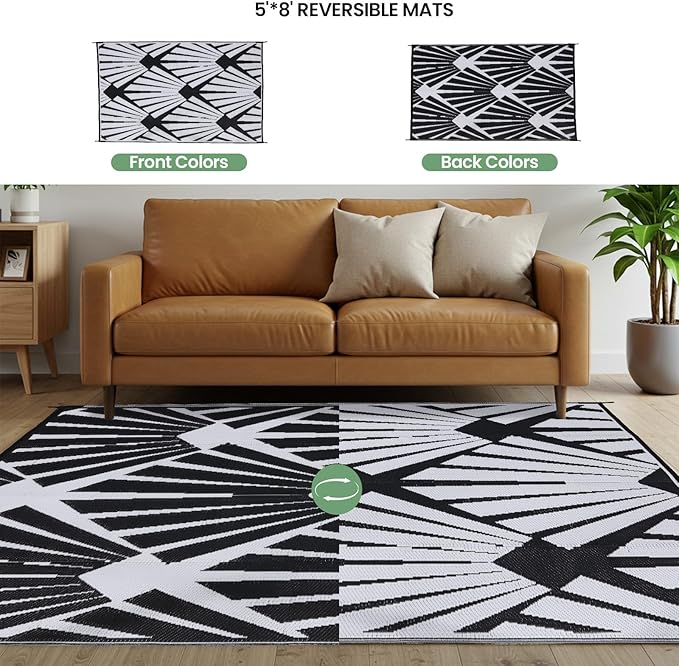 Outdoor Rug for Patio, 5x8 Ft Reversible Outdoor Plastic Straw Rug Waterproof Foldable Camping Mat with Uv Protection, Quick-Dry Straw Patio Carpet for Deck Rv Porch Backyard - Black&White