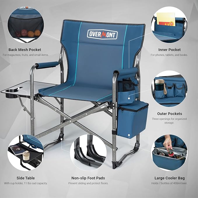 - 【Cup holders & Detachable Side Pocket Design】Overmont directors chair for adults features side cup holders for easy drink access. Detachable Side Pocket includes a spacious cooler bag and storage pockets. The carry straps on both armrests for easy take away. And a mesh pocket on the back for added convenience and organization outdoors.