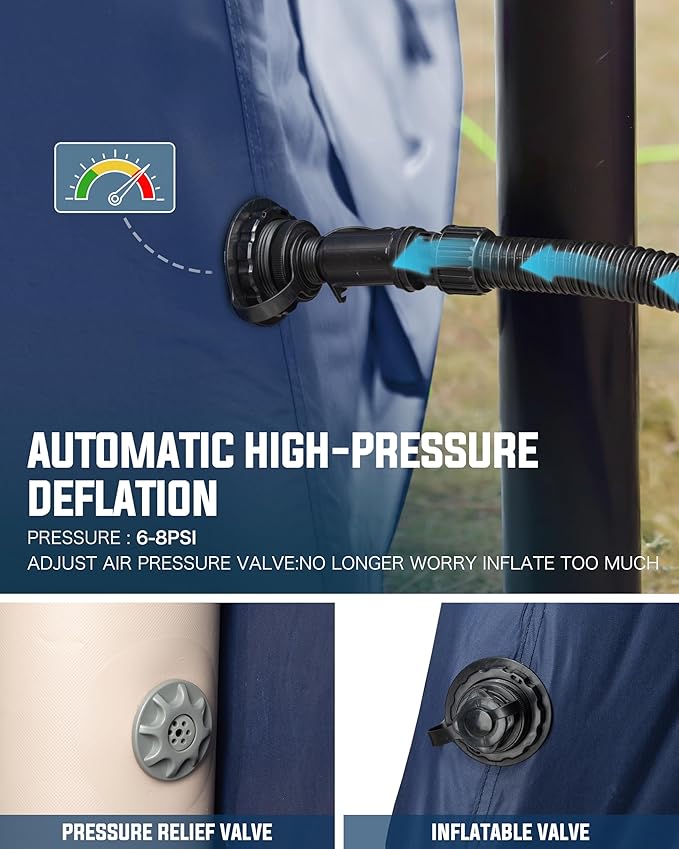 - 【EASY INSTALLATION】The inflatable camping tent does not need manual installation of support rods, and it has TPU inflatable pillars. Equipped with a manual hand pump, then you can finish assembling the camping tent in only 5 minutes.Equipped with durable steel nails and windproof rope make the tent more stable. Make your camping trip more enjoyable and comfortable.